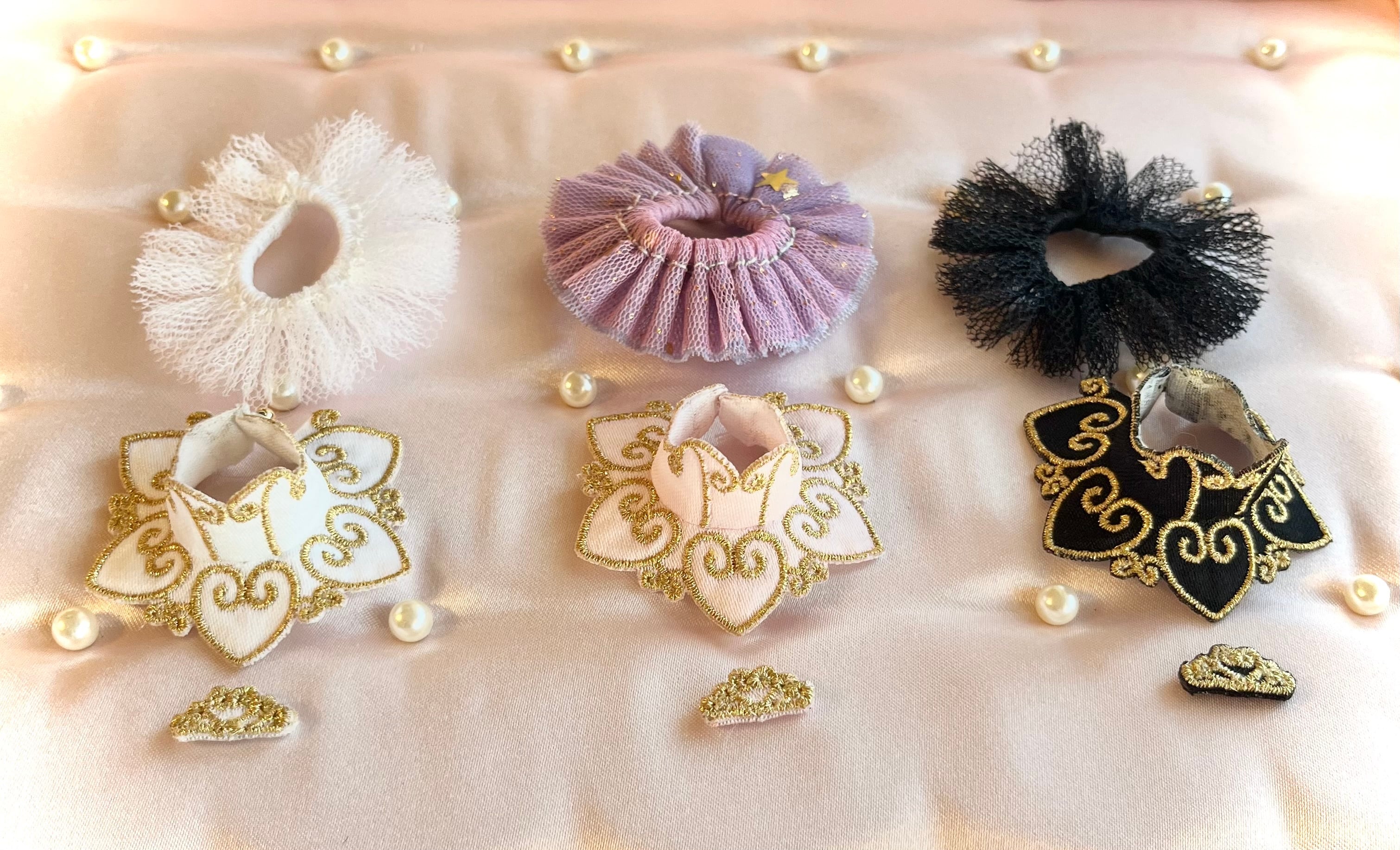 ティアラは裏面にビニールを縫い付けてありますので、ビニール部分にひっつき虫等の剥がせる粘着剤をつけてドールに着用してください